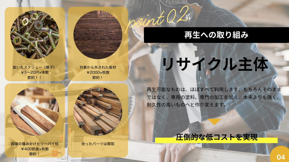 たとえば内装施工対象から取り外された痛みの少ない板→再生加工をかけ、新品よりも耐久性、耐経年性に優れた板へと復活=材料代金¥2000の節約に加え、施工箇所の延命も達成!!