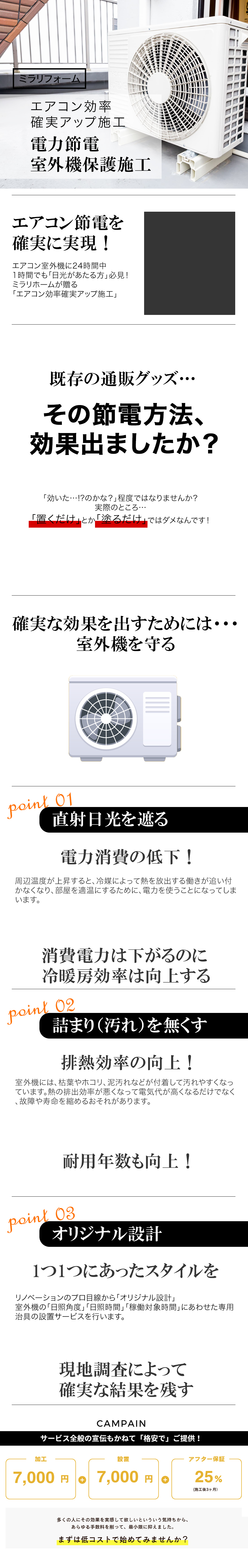 1台2万円以下の施工費で、エアコン室外機を「日照とは無縁の世界」にワープさせるミラリホームです!